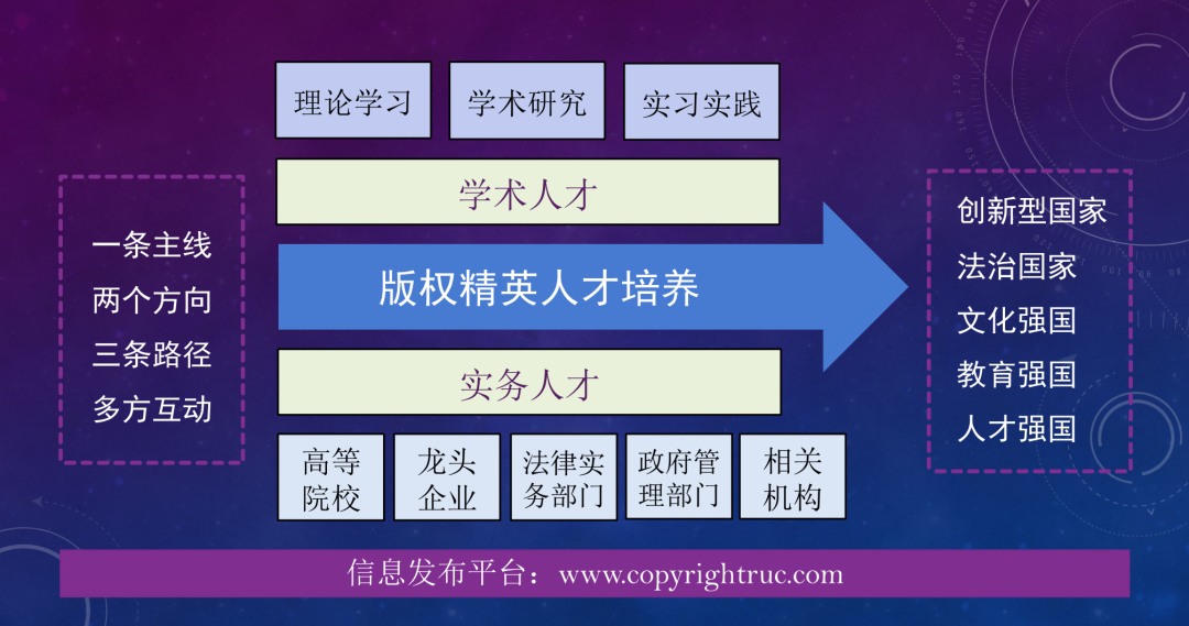具体来说,“中国版权英才计划”围绕“一条主线、两个方向、三条路径、多方联动”的思路培养人才。其中,“一条主线”指的是所有的工作围绕“培养中国顶尖的版权精英人才”进行;“两个方向”指的是培养的版权专业人才包括学术人才和实务人才两个方向;“三条路径”是指平台组织开展更有针对性的理论学习,包括各种直播课、公开课、研讨会、沙龙等各种学习和交流活动,有针对性地指导学生参与最前沿的理论研究,联合相关企事业单位为在校大学生提供实习实践机会等;“多方联动”意味着人才的培养需要各高等院校、版权管理部门、法律实务部门、行业龙头企业等相关机构的融合联动。