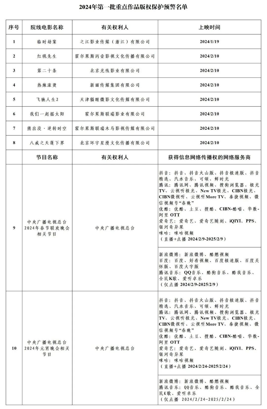 【2024年度第一批重点作品版权保护预警名单公布】 2月7日,国家版权局公布了2024年度第一批重点作品版权保护预警名单。名单如下: